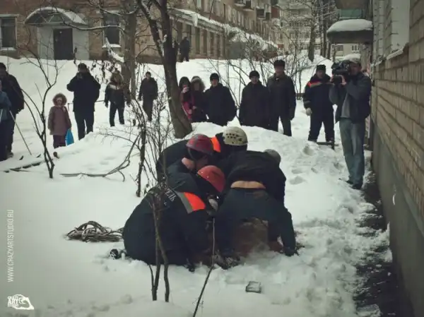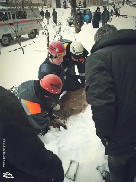 Толпа зевак во главе со спасателями думает над дальнейшей судьбой животного
