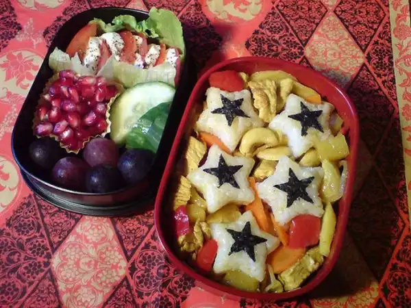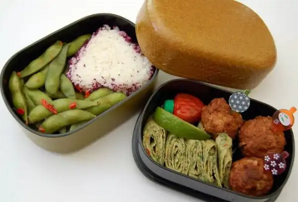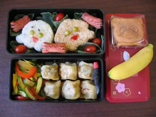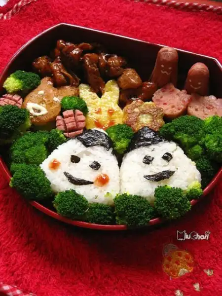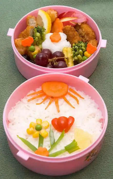 Бенто - это японское искусство собирать из еды разные узоры.В основном эти картинки собирают из покрашенного риса.Получается довольно необычно и интересно, даже жалко съедать такую красоту.