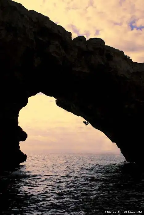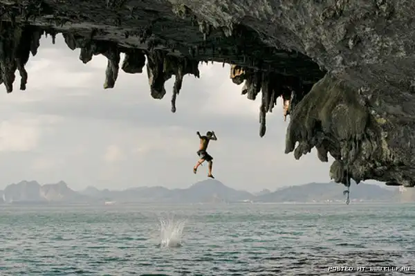 Этот вид спорта называется "deep water solo". По-русски говоря - одиночное лазание на естественном горном рельефе над водоемом без страховки. Спортсмен не применяет никаких искусственных приспособлений, кроме специальной обуви и магнезии, но активно использует для подъема возможности своего тела: гибкость, силу рук и ног.