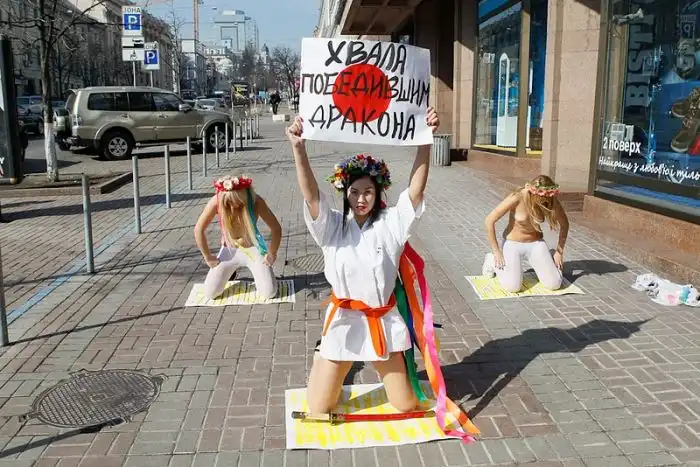 FEMEN провели акцию в поддержку японского народа «Хвала, победившим дракона». Хоть у девушки в главной роли красивая грудь, не думаю, что японцы оценят подобную акцию.