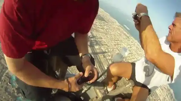 Съемка со смотровой площадки на высоте 500 метров небоскреба Бурдж-Халифа. Само здание имеет высоту 828 метров, но на верхних этажах еще не закончились отделочные работы, поэтому выше не пускают.