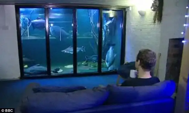 Аквариум реально огромен, возможно один из самых больших частных аквариумов в мире ... Джеку приходится погружается в него раз в две недели чтобы почистить.