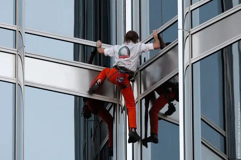 «Человек-паук» Ален Робер, известный тем, что он забирается на разные высотные здания, покорил очередную высоту — он влез на небоскреб «Бурдж-Халифа» — самое высокое здание в мире (828 м). Подъем занял у Робера шесть часов, после 700 метров он был вынужден воспользоваться страховочным оборудованием. Процесс покорения небоскреба транслировался для многочисленных зрителей на гигантском видеоэкране размером 50х30 метров. Организаторам шоу не удалось договориться с местными властями, чтобы «Человека-паука» после восхождения, по традиции, арестовала полиция.