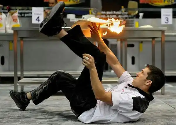 Если вы думаете, что приготовление пиццы - дело степенное и серьезное, то страшно удивитесь. Это спорт, близкий к экстремальному. На Чемпионате мира по приготовлению пиццы на севере Италии участники жонглировали тончайшими кругами теста, делали с ними акробатические номера и поджигали.