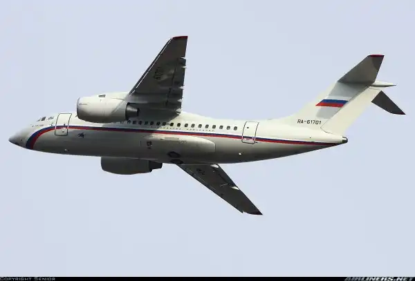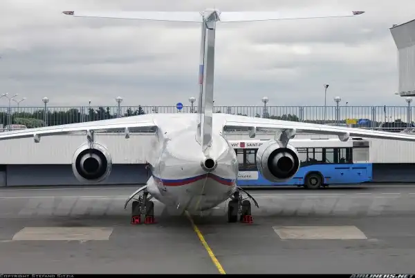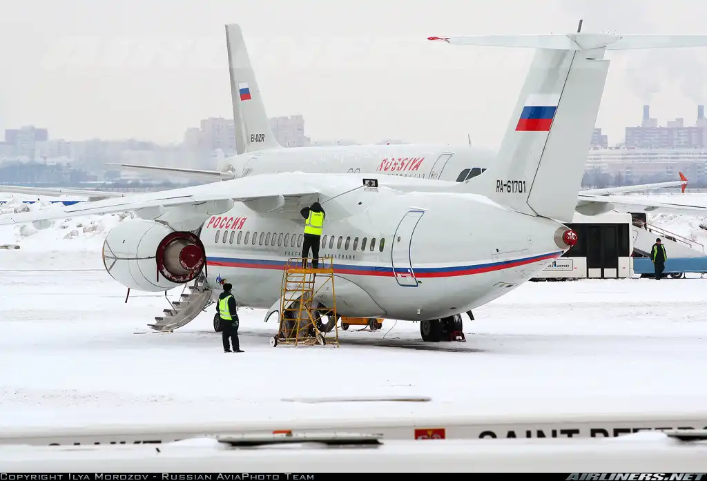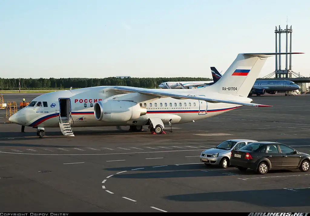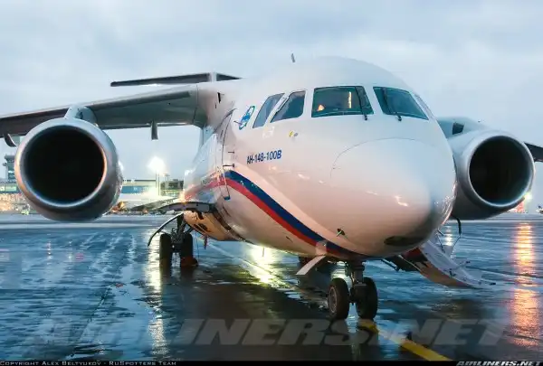 Ан-148 - региональный ближнемагистральный самолёт. Спроектирован киевским АНТК им. Антонова, в программе производства задействованы завод "Авиант" на Украине и "Воронежское акционерное самолетостроительное общество" в России. В компановке ГТК "Россия" Ан-148 рассчитан на перевозку 68 пассажиров: 8 мест отведено для бизнес-класса, 60 - для экономического. Дальность полёта составляет 3,5 тысячи километров, крейсерская скорость - 800 - 870 километров в час. Особенностью этого типа ВС является высокое расположение двигателей, что позволяет самолёту совершать взлёты и посадки даже на аэродромах с низким качеством покрытия. Современное бортовое оборудование делает возможным посадку машины в сложных метеорологических и ночных условиях.