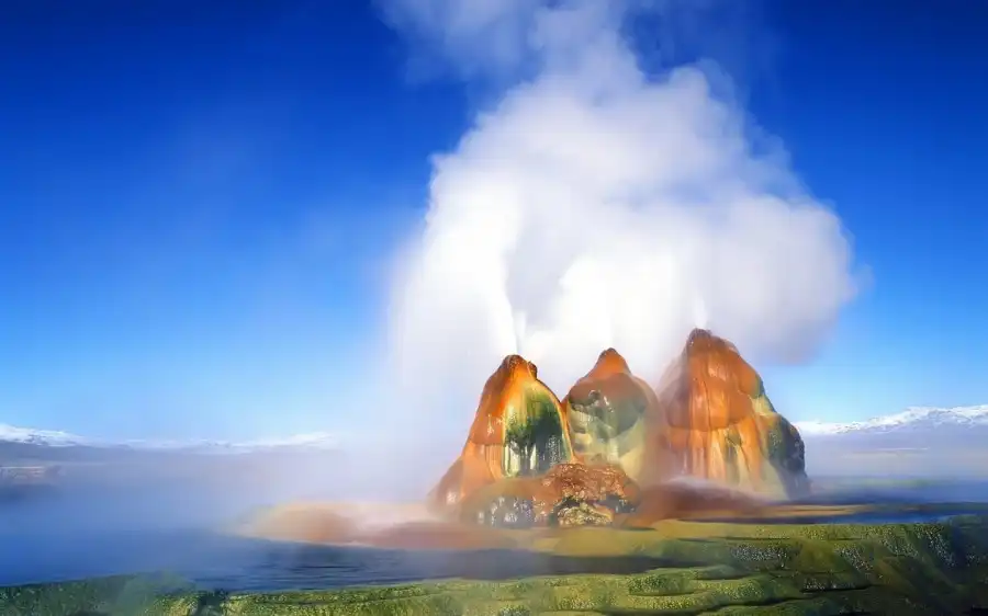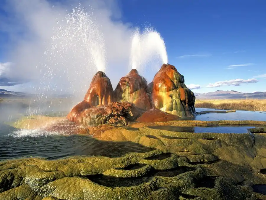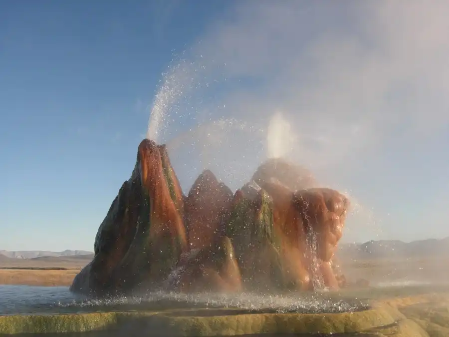 ... где пролегает Великий Бассейн с оставшимся котлованом высохшего озера Лахонтан. В пустыне встречаются многочисленные вулканические и геотермальные образования, особенно в северо-восточной части вулканического региона Невады, включая два Пика Черного Камня, где вулканические скалы Пермиан формируют естественную дамбу на озере Невада.