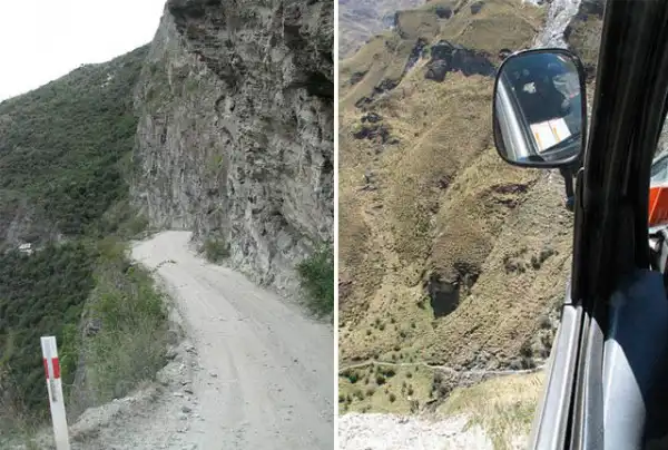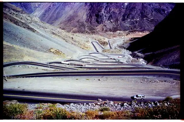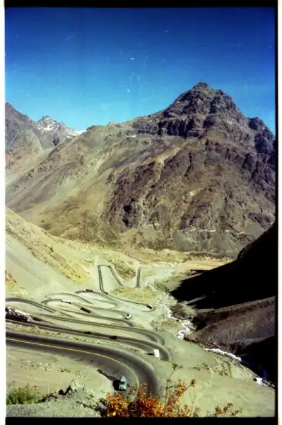 Это интересное место называется горный перевал Los Libertadores, который проходит в Андах между Чили и Аргентиной. Дорога является достаточно крутой и извилистой, а если добавить ко всему отсутствие ограждений, то большие грузовые автомобили и туристические автобусы подвергаются здесь реальной опасности. Одно неверное движения руля, и вот вы летите, кувыркаясь по горам.