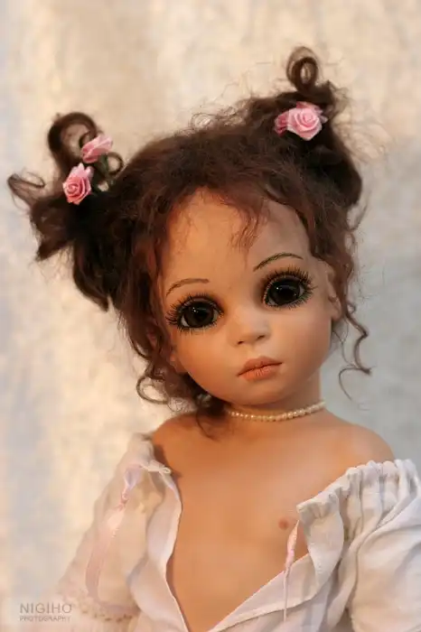 Автор работает исключительно с фарфором. Куклы делаются либо целиком из фарфора, либо - фарфоровые ручки, ножки и головка крепятся к плотно набитому телу. У большинства кукол двигаются головы, у некоторых есть некая, хотя и ограниченная подвижность ручек. Особенно запоминаются глаза этих игрушек – огромные, выдутые из лучшего стекла специально для этих кукол, сияющие в свете лампы, почти живые.