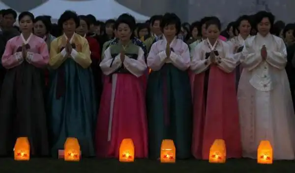 14. Буддисты в центре Сеула 26 апреля 2011 молятся перед фонарями освещения, в честь предстоящего дня рождения Будды, который в Южной Корее приходится на 10 мая2011 г.
