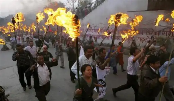 23. Активисты и сторонники из Newar и Tamang сообществ принять участие в факельном митинге, Катманду.