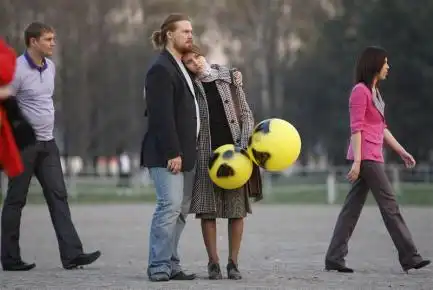 11. Пара с воздушными шарами с эмблемой радиации стоит в Минске на митинге посвященной памяти жертв Чернобыля. Оппозиции выступает против строительства АЭС в Беларуси.