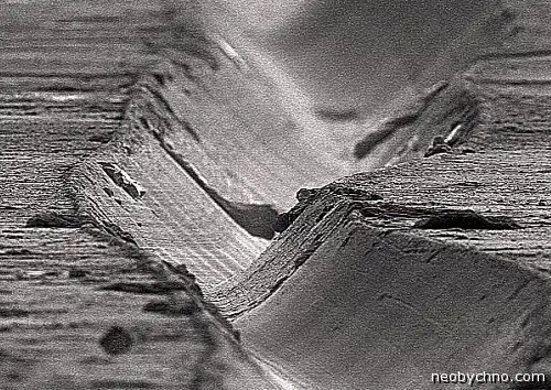 А вот как под мощнейшим микроскопом выглядит кончик очень острой иглы из вольфрама:
