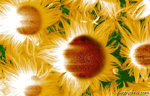 На цветы подсолнуха похожи нановолокна оксида кремния. Удобрениями для цветения стали катализаторы роста на основе золота и легкоплавкого металла галлия. Диаметр золотистых волокон — всего 10 нанометров, а длина — несколько микрон.