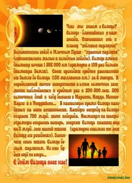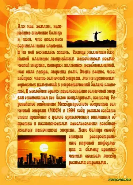 Значение Солнца в нашей жизни трудно переоценить. Солнце — источник жизни на Земле. С глубокой древности все народы поклонялись Солнцу. В последнее время все более популярным становится использование дешевой и экологичной солнечной энергии. Чтобы привлечь внимание общественности к использованию этого вида энергии Европейское отделение Международного общества солнечной энергии (МОСЭ) предложило ежегодно, начиная с 1994 года, 3 мая проводить День Солнца.