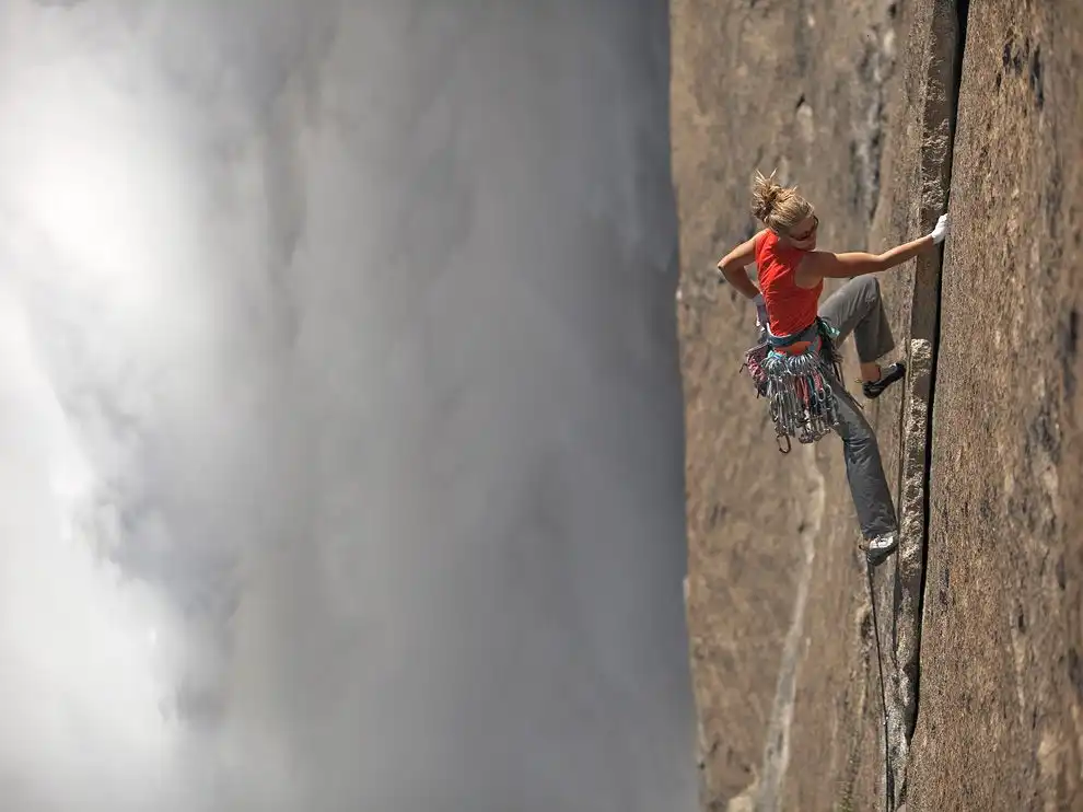 Водопад Йоссемит Фоллз. Альпинистка Кейт Рузерфорд (Kate Rutherford) с трудом взбирается на отвесную скалу самого высокого в Северной Америке водопада Йосемит Фоллз по маршруту, который называется Freestone. Скала, отполированная водой, не дает альпинистам надежных зацепок, поэтому маршрут считается одним из самых опасных. Потрясающий пейзаж делает восхождение еще более опасным, рассеивая внимание. Тем не менее, Кейт утверждает, что «маршрут по-настоящему прекрасен».