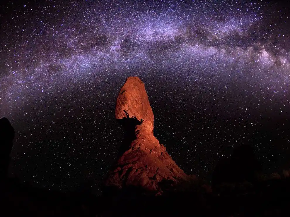 Национальный парк «Арки», Юта, США. Млечный путь виден над скалой Балансд Рок в Национальном парке «Арки», штат Юта.
