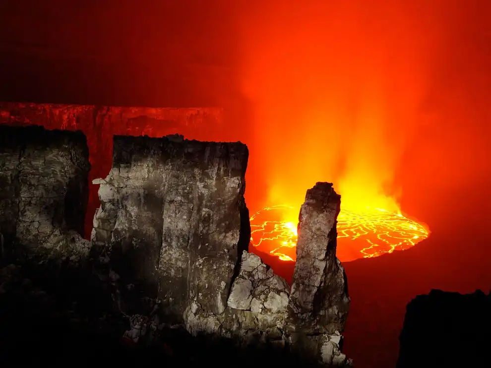 Кипящая лава Ньирагонго, Конго. Кипящее озеро лавы вулкана Ньирагонго, что находится в Конго – одно из самых больших подобных озер, более 700 футов (213 метров) в длину, а глубина его составляет, возможно, километры. Уже дважды потоки лавы вырывались из озера и текли по направлению к Гома.