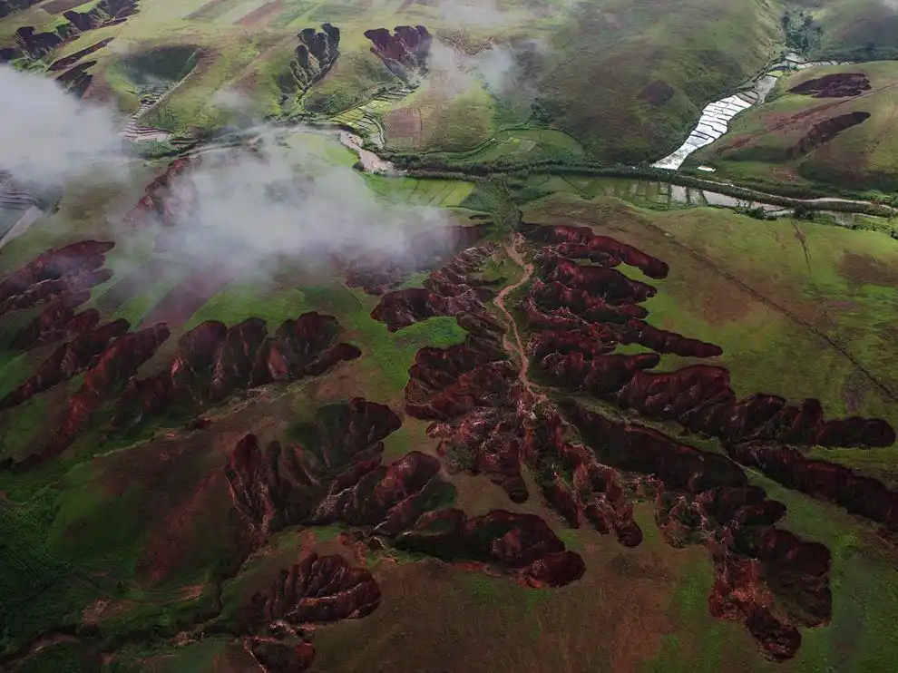 Эрозия почвы на Мадагаскаре. Эрозия почвы создает узор, похожий на жилки на поверхности листьев на Мадагаскаре. Эрозий – одно из последствий незаконной вырубки палисандрового леса, ценной породы красного дерева.