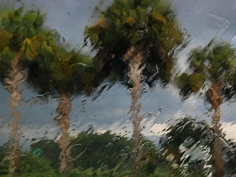 Гроза, Флорида. В этом солнечном штате грозы гремят почти каждый день. Рассказывает фотограф Майкл Робертс: «Я работаю в стрип-молле (это длинное одноэтажное здание, разделённое на секции, в которых размещаются магазины; обычно находящееся вдоль автотрасс). Когда началась гроза, я решил сделать несколько фотографий, снять верхушки деревьев и небо. Дождь полили мгновенно, очень сильный, я вынужден был искать укрытия в машине. Потому я сделал фотографию сквозь ветровое стекло. Получилось забавное искажение и, мне кажется, мне удалось передать ощущение грозы во Флориде».