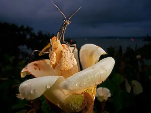 Богомол, Панама. На переднем плане фотографии – богомол, поджидающий, а в ночи насекомых себе на ужин. На заднем плане – сигнальные огни автомобилей, пересекающих Панамский канал.