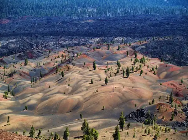 Разноцветные дюны, национальный парк Лассен-Волканик, Калифорния. Разноцветные дюны видны за Синдер-Коун. Их цвета – результат вулканической активности. Красота просто неописуемая. Пейзаж чем-то напоминает полотно, написанное масляными красками или гобелен, вытканный самим Богом.