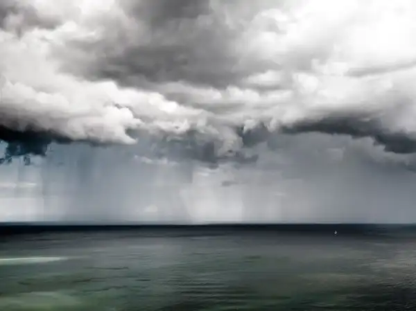 Одинокая лодка в море, Германия. В Ясмунде, Национальном парке на северо-востоке Германии, закончилась гроза, море было абсолютно тихим, а на горизонте виднелась крошечная лодка.