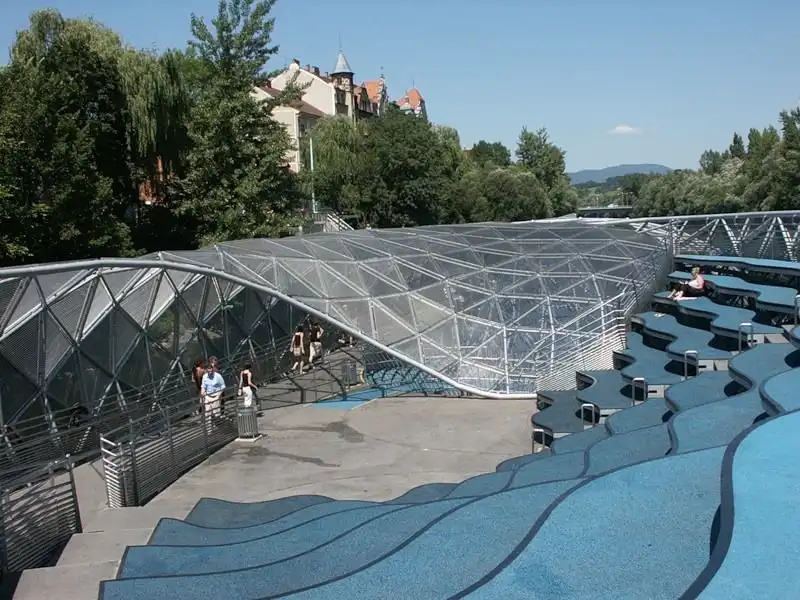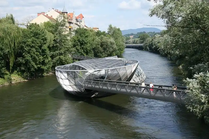 Австрийский город Грац является вторым по значению после столицы. Популярность и известность городу принес Арнольд Шварцнеггер, который здесь родился. Но многие покупают туры в Австрию, чтобы посетить необычный мост, соединяющий два берега реки Мур. Если быть более точным, это не просто мост, а мост с "островом" посередине реки (отсюда название - Aiola Island). Этот шедевр современной архитектуры был построен в 2003 году, и это идеальное место, где можно спрятаться от внезапного дождя, к тому же, на мосту может находиться до 350 человек одновременно. Своим появлением он обязан архитектору из Нью-Йорка Вито Акконси. "Мы хотели создать место, которое визуально будет разделено на две определенных зоны, и эти зоны должны постепенно сливаться в одно единое целое" - объясняет Вито Акконси.
