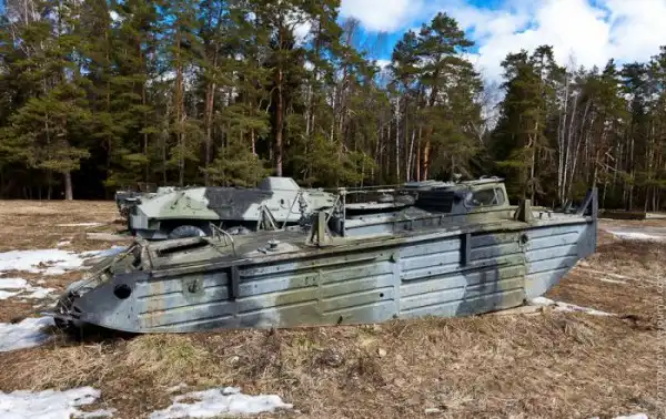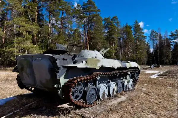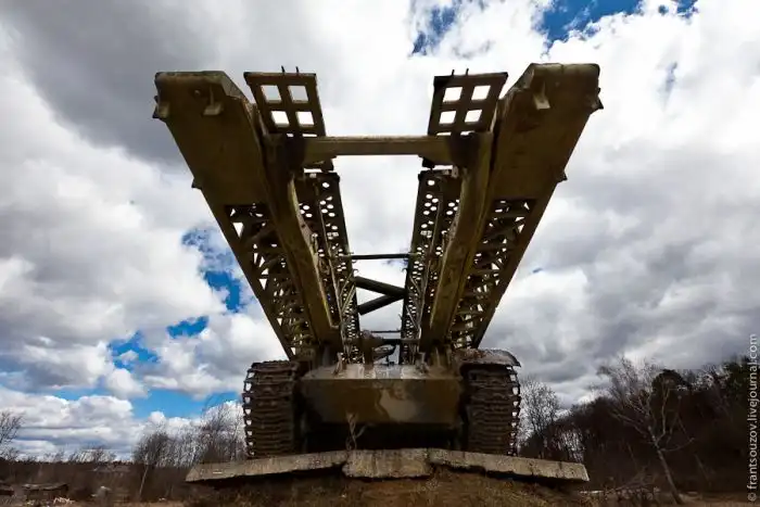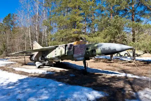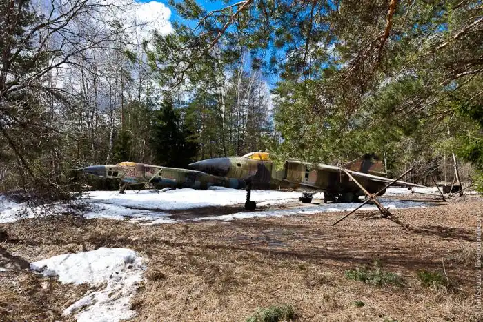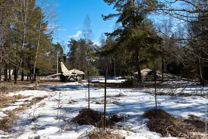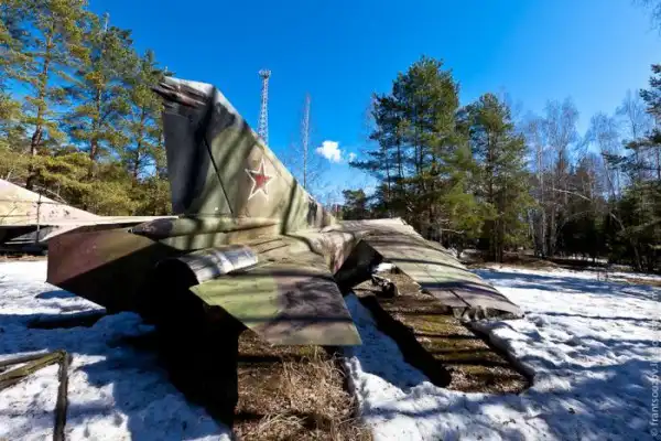 В глухом подмосковном лесу нашли военную базу, которая скорее всего служила для тренировки солдат. На поляне стоит два самолета Миг-23, передвижной мост, который помогал другой крупной технике преодолевать препятствия, несколько фанерных макетов военных машин и даже памятник в честь запуска первых жидкостных ракет.