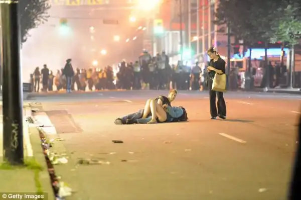 Но быстро выдохлись. После того, как полицейские отстали, Скотт поцеловал свою плачущую подругу, чтобы успокоить ее. Эта фотография и обошла весь мир - вот, мол, нежность посреди хаоса. Занимайтесь любовью, а не войной, и все такое.