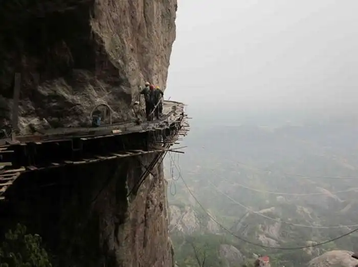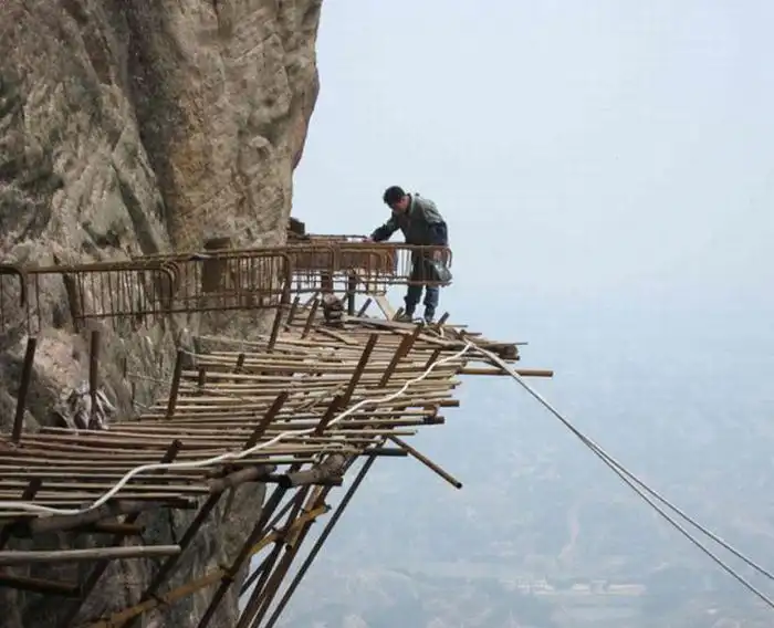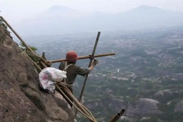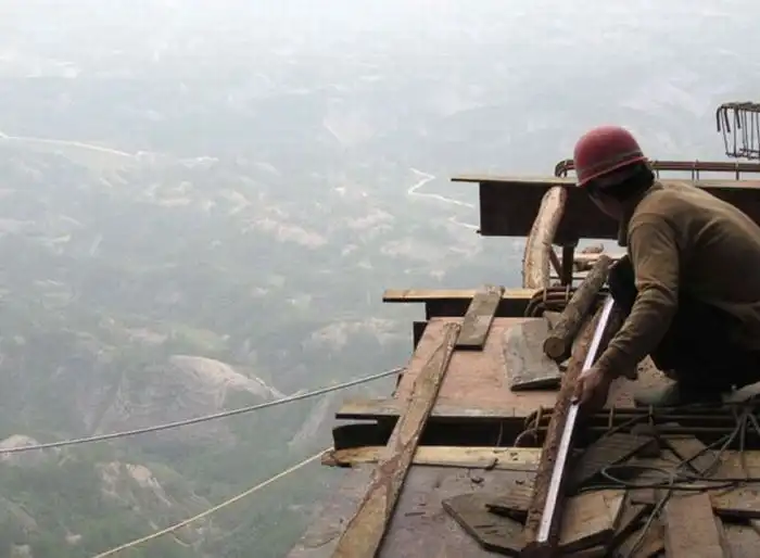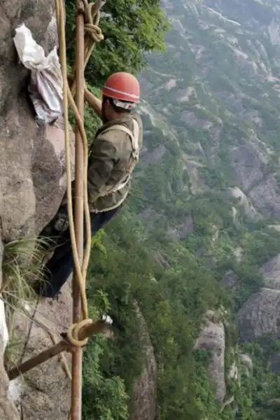 Китайские рабочие строят путь, огибающий горы. Работа очень опасная и страшная, самое удивительное, что они работают без страховки, только каска, которая ничем не поможет при падении. Видимо они об этом стараются не думать, а все силы вкладывают в строительство, молодцы все-таки они.