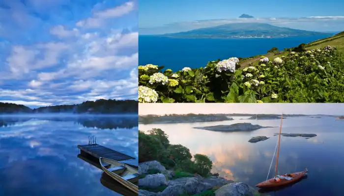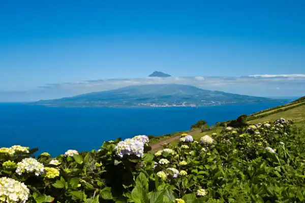 Азорские острова, Португалия. Зеленые горы вулканического происхождения, минеральные горячие источники, покрытые гортензией холмы, виноградники и живописные приморские города.