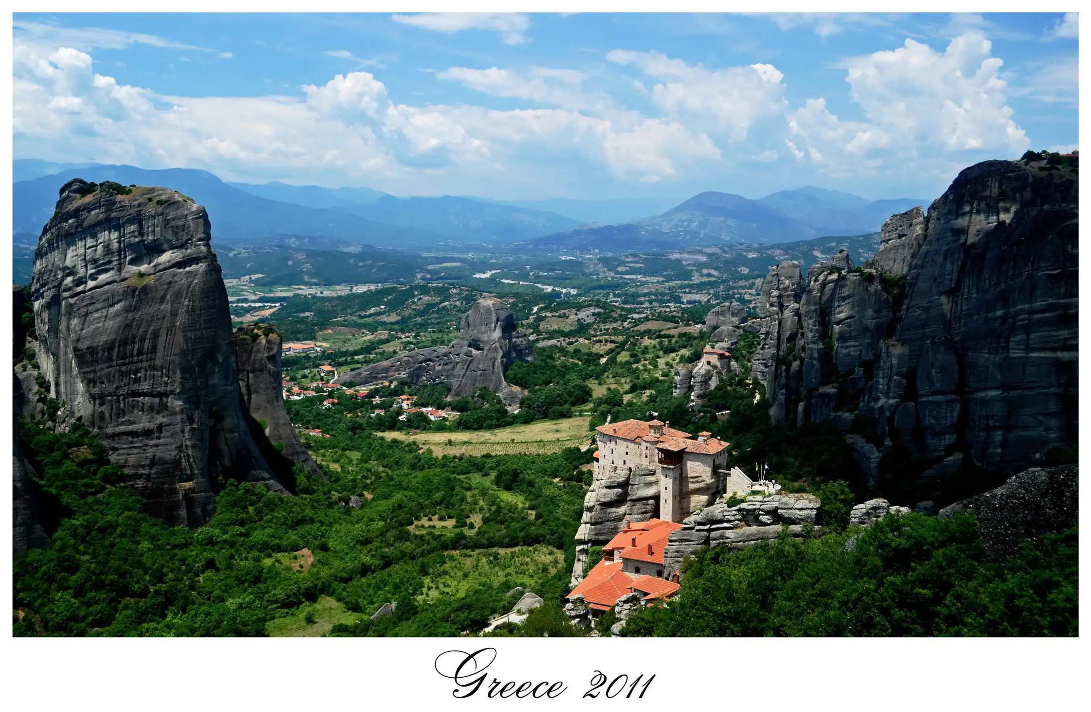 Ездили поглазеть на Метеоры. Метеоры (греч. Μετέωρα) — один из крупнейших монастырских комплексов в Греции, прославленный, прежде всего, своим уникальным расположением на вершинах скал. Монашеский центр был образован около X века и с тех пор существует непрерывно. В 1988 году монастыри были включены в список объектов всемирного наследия. По административно-церковному делению входит в митрополию Стаги и Метеор (греч. Σταγών και Μετεώρων) Элладской православной церкви.Шесть действующих православных монастырей, расположены на вершинах грандиозных скал, находящихся на ровной поверхности Фессалийской равнины. Скалы достигают в высоту 600 метров над уровнем моря и являются редким геологическим явлением. Они образовались более 60 миллионов лет назад и являлись каменистым дном доисторического моря, находившегося на месте равнины.[1] В результате воздействия воды, ветра и перепадов температур получились массивные, как бы зависшие в воздухе каменные столбы, получившие название Метеоры (от греч. μετέωρα — «парящие в воздухе»).