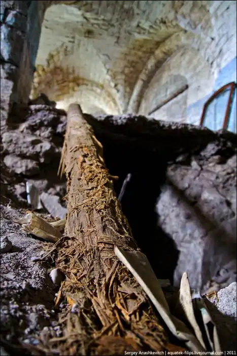 Обрушение от прямого попадания авиабомбы около северной башни. Работники музея Шереметьева, которые занимаются реставрационным работами в Михайловской батарее проводят раскопки в этом месте, вынимая камень за камнем. В день, когда я проводил съемку мне показали сейф под завалами из бревен, к которому уже можно прикоснуться. Однако ребята не спешат вытаскивать находку...