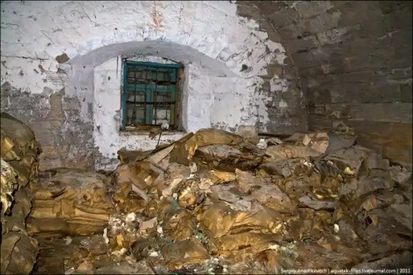 Мешки с известью лежат здесь тоже с незапамятных времен. Разобрать их непросто - ведь это фактически сплошной спрессованный камень