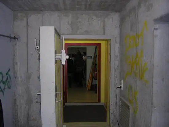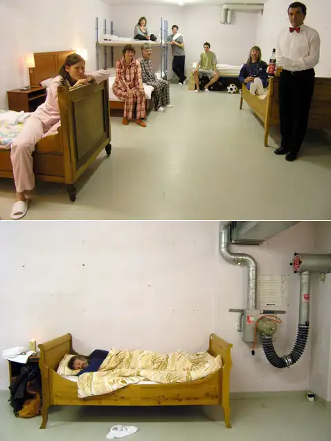 Когда-то здесь проводили учения военные, а сейчас надобности в бомбоубежище (принадлежащем государству) вроде как нет. Между тем содержать его необходимо (по закону), что ложится на местный бюджет дополнительной ношей. Потому местные художники — братья Патрик и Франк Риклины — по заказу муниципальных властей провели «операцию» по превращению бункера в гостиницу.
