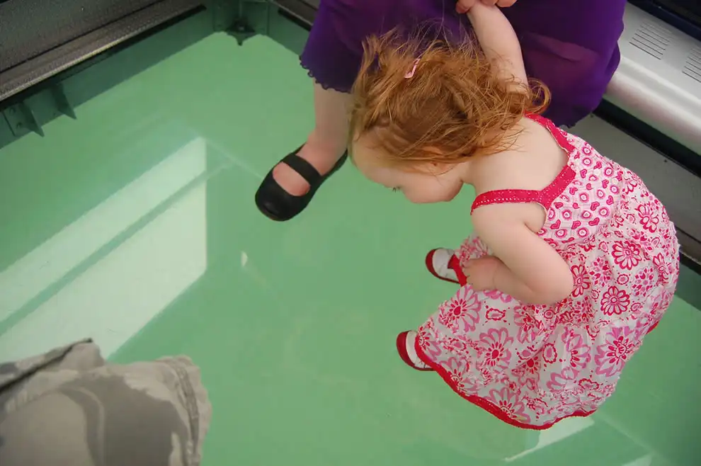 Маленькая девочка на стеклянном полу вагончика в кабинке Нгонг Пинг. Под ногами туристов через стеклянный пол открываются удивительные виды на остров Лантау в Гонконге. До недавнего времени единственным способом добраться до некоторых достопримечательностей была горная дорога.