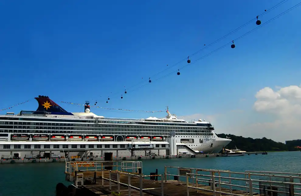 Лайнер «Star Virgo» в гавани Сингапура, а над ним – канатная дорога с туристами на острова Сентоса.
