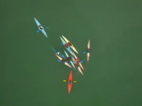 Каяки в заливе Танг Чанг, вид через стеклянный пол кабинки на канатной дороге. Канатная дорога поддерживается восемью башнями. Вагончик содержит в себе 10 сидячих мест и 7 стоячих. Проходимость системы – 3500 человек в час в каждом направлении.