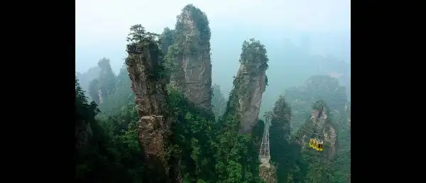 Канатная дорога в Чжанцзяцзе, Китай. В этом парке полно карстовых колонн песчаника, а сам парк покрыт тропическими лесами. Очень часто парк окутан туманом, отчего пейзажи становятся таинственными, но жуткими.