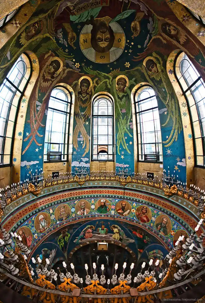 Внутри храм представляет собой настоящий музей мозаики, площадь которой составляет 7 065 квадратных метров. Мозаика создавалась в мастерской В.А. Фролова по эскизам более 30 художников, среди которых были такие художники, как В.М Васнецов, М. В. Нестеров, А. П. Рябушкин, В.В. Беляев, Н. Н. Харламов. Мозаичная экспозиция Спаса-на-Крови является одной из крупнейших коллекций в Европе.