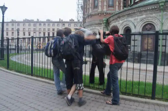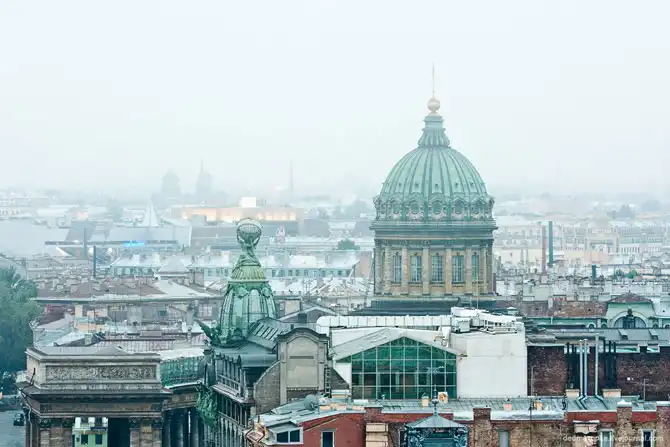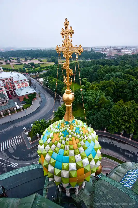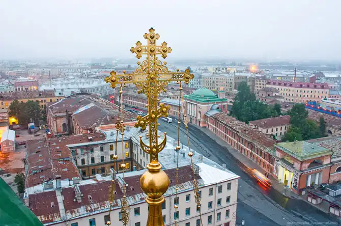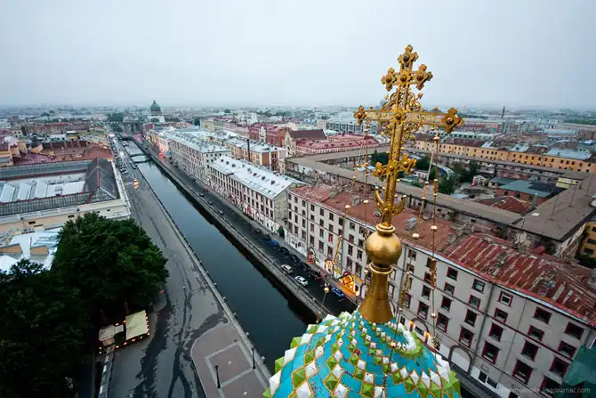 Милицейские машины, люди, камеры – ничто нас не заметило на самом залазе. Буквально по зданию мы поднялись на самый верх и стали фотографировать. Честно говоря, я был в шоке от того, как и куда мы залезли, хотя, это был даже не шок, а по большей части восторг :) Красивые виды, утренний туман и величие храма – еще одно незабываемое впечатление от моей поездки в Питер.