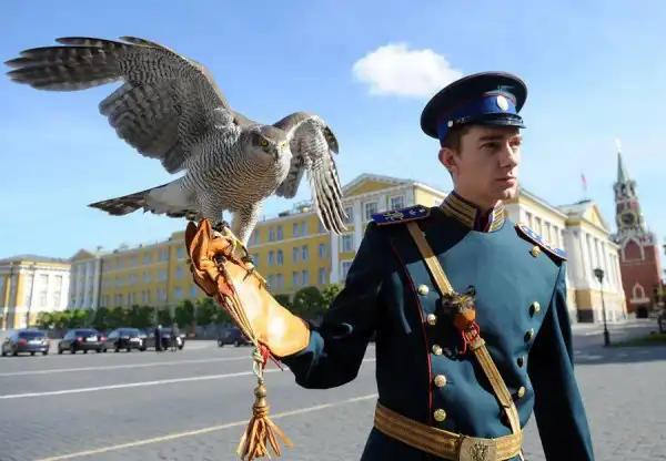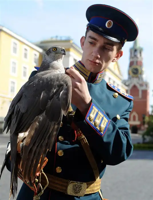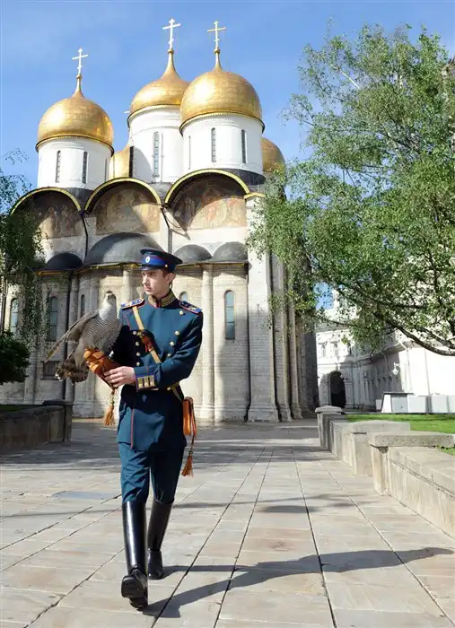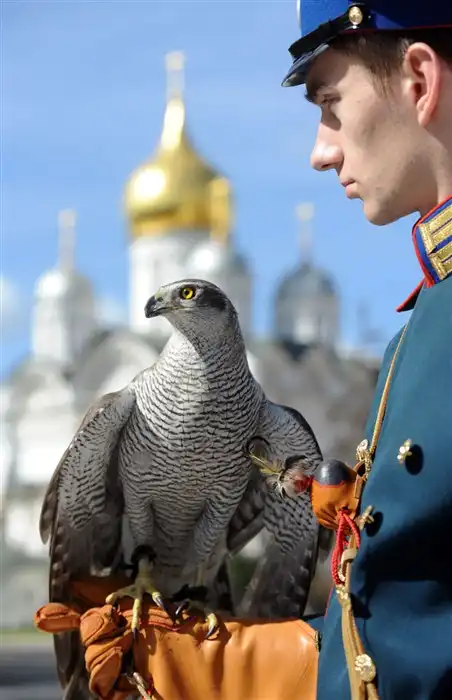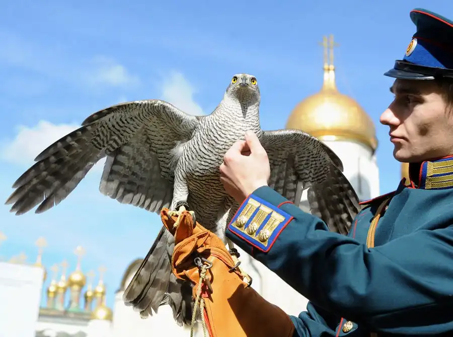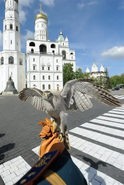 Мало кому известно, что при комендатуре Московского Кремля служат четыре сокола. Этих птиц обучают специально. Они помогают охранять культурное наследие Кремля, в частности, отпугивают ворон, которых привлекает золото на куполах соборов.