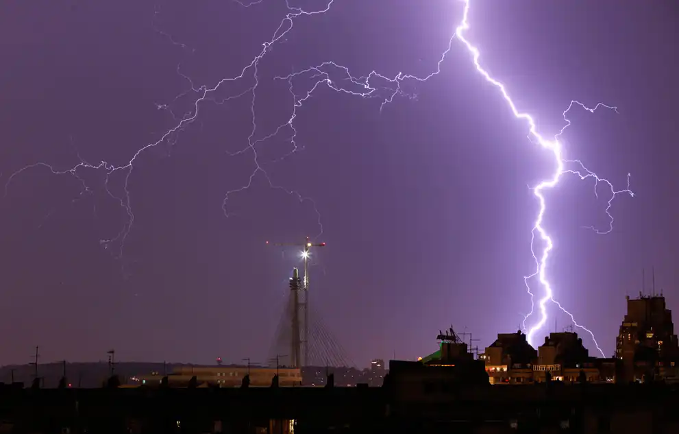 Молнии над зданиями во время грозы в Белграде.