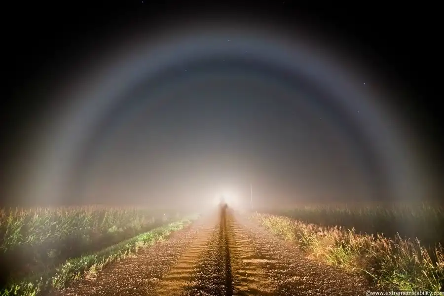 Туманная радуга перед автомобилем в западной части Айовы. Туманная радуга – это радуга, представляющая собой широкую блестящую белую дугу, обусловленную преломлением и рассеиванием света в очень мелких капельках воды.