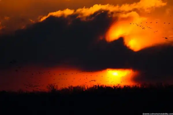 Грозовой закат солнца и стая гусей неподалеку от заповедника Скво-Крик в Миссури.