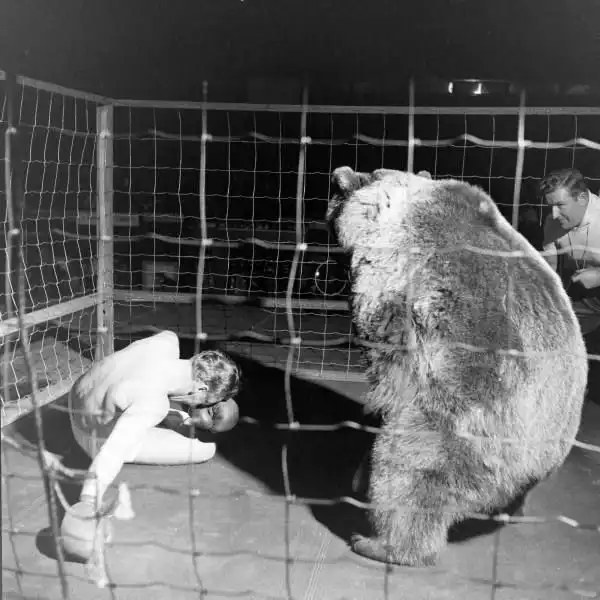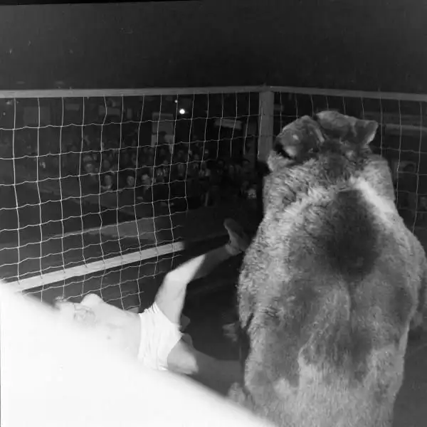 В 1949 провели матч между медведем и человеком (боксером Гусом Уольдорфом). Конечно, медведь был дрессированным, а матч постановочным, иначе боксеру не поздоровилось.
