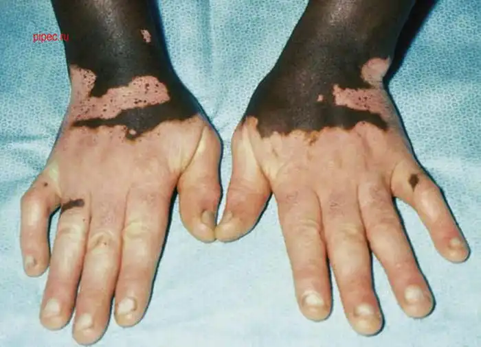 Это заболевание кожи,называется ВИТИЛИГО(кажется так)