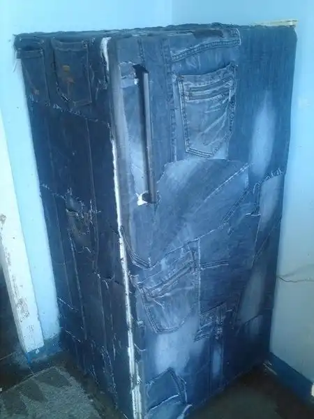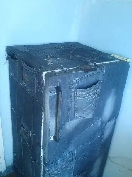 Еще часа три вытираем тряпкой пол вокруг холодильника, потому как клей, разбавленный водой очень долго стекает по джинсовой ткани. Часов за 8-9 он высохнет окончательно и будет удивлять зашедших в гости друзей.