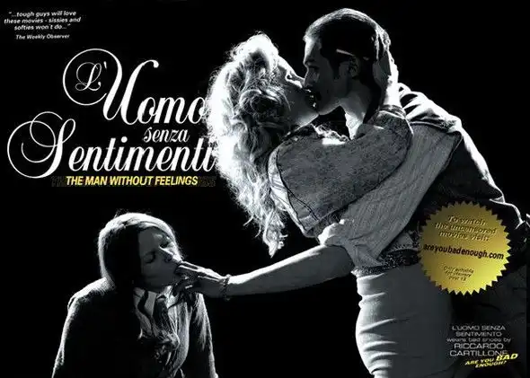 Мелкий текст этой рекламы рассказывает о том, что раньше девушка была настоящей тигрицей, но когда увидела его брюки, то жгуче захотела, чтобы мужчина в таких элегантных штанах мог попирать ее сколько ему вздумается.