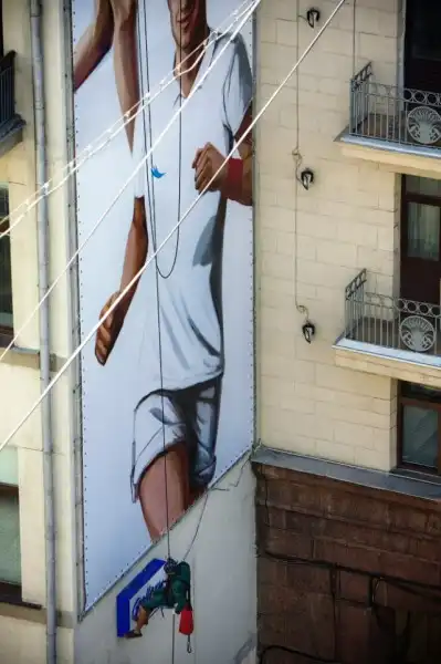 Внезапно на крыше с плакатом появляются два чувака в обвязках, с веревками и рациями.